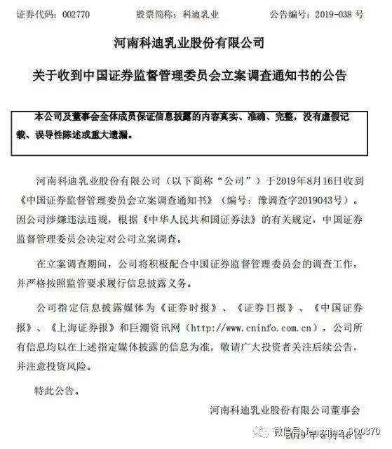 8月16日,河南科迪乳业股份有限公司(简称科迪乳业)公告称,因公司涉嫌违法违规,根据《中华人民共和国证券法》的有关规定,中国证券监督管理委员会决定对公司立案调查。
