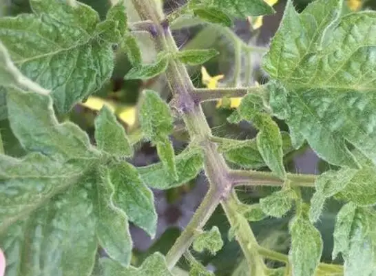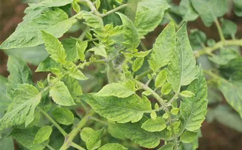 西红柿缺乏磷元素的症状主要表现在上部叶片和茎秆上,尤以长出的新叶和顶端茎秆表现最为明显;西红柿缺乏磷元素初始期,在新舒展的叶片上或单独或多片叶子中间出现微微泛紫的症状,这是因为植株体内微量元素不均衡,西红柿叶片光合作用变差,致使花青素淤积不能及时转化造成的;随着缺磷症状的进一步发展,叶片泛紫部位逐渐扩大,致使整个叶片全部失绿,颜色也由紫红变成深红;随着新叶不断萌生,新叶不断出现紫红症状,舒展叶层深红程度不断加深,也会蔓延到顶端茎秆上;顶端茎秆先由局部紫红变成深红,随着缺素现象的加剧,或缺素症状得不到及时改善,顶端茎秆紫红和深红长度不断增加,与紫红的叶片叶柄连接成株,远远看去,火红一片;西红柿磷元素缺乏会致使西红柿生长缓慢,缺素严重的情况下,西红柿生殖生长停滞;发红叶片随着缺素程度加深会逐渐失水卷曲萎缩并枯萎落叶,叶片也失去光能转化能力,出现落花落果,果实膨大速度慢,果肉空瘪,果实转色慢,转色不均匀或不转色的现象;不仅降低西红柿的产量,也严重影响西红柿的品质和商品性能。
