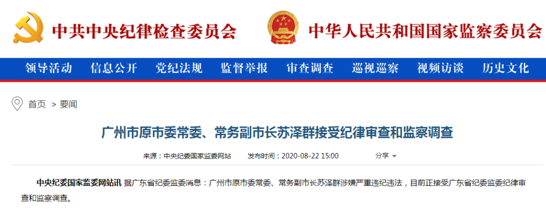 据广东省纪委监委消息:广州市原市委常委、常务副市长苏泽群涉嫌严重违纪违法,目前正接受广东省纪委监委纪律审查和监察调查。