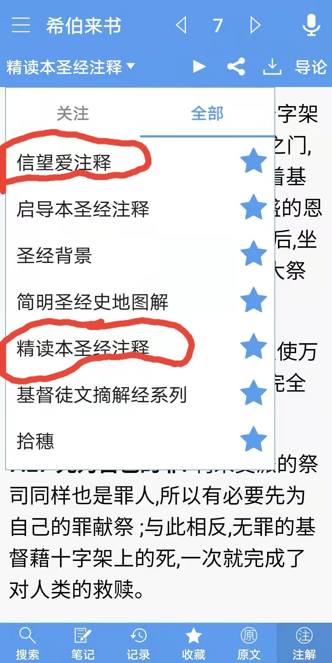 这是精读圣经非常强大的地方,提供了17种圣经注释书,主要的,流行的圣经注释都有,而且查阅非常方便,我们重点推荐“信望爱注释”和“精读本圣经注释”两种。
