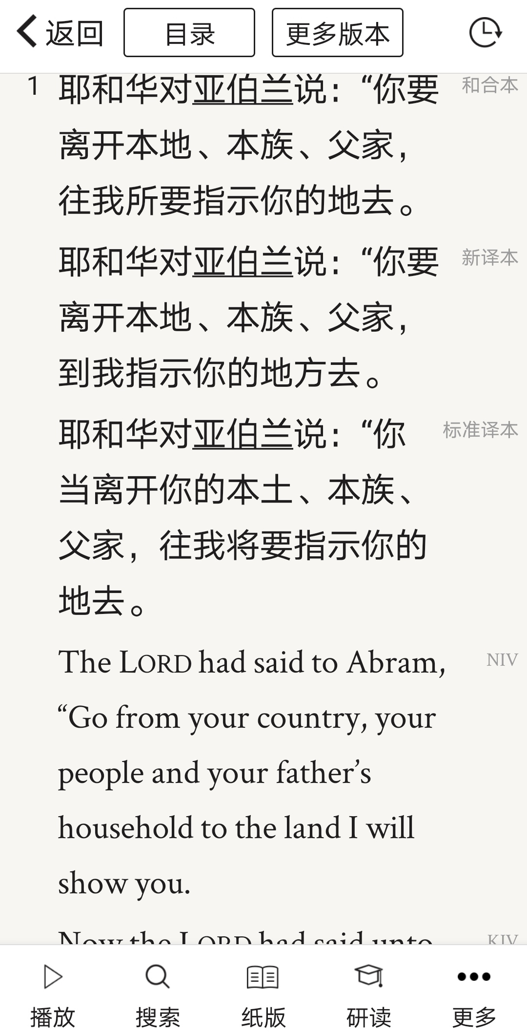 除了常用的和合本圣经外,还提供最多18个中文版本,7个英文版本的对照阅读: