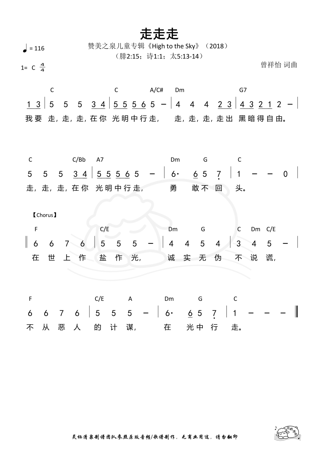 +- 首页 未整理 正文 走走走 ©️ 赞美之泉音乐事工 歌名 | 走走走 Artist | 赞美之泉 专辑 | 《High to the Sky 》(2018) 词曲 | 曾祥怡 歌词 【Verse】 我要走走走 在你光明中行走 走走走 走出黑暗得自由 走走走 在你光明中行走 勇敢不回头 【Chorus】 在世上作盐作光 诚实无伪不说谎 不从恶人的计谋 在光中行走 请支持赞美之泉事工:www.sop.org/donation 赞美诗歌未整理以斯拉盛晓玫祝瑞莲生命河灵粮堂小羊诗歌Jesus Image天韵合唱团新酒使命团我心旋律JLSS BlessedThe Hope佳音 赞美之门 收藏 分享 链接